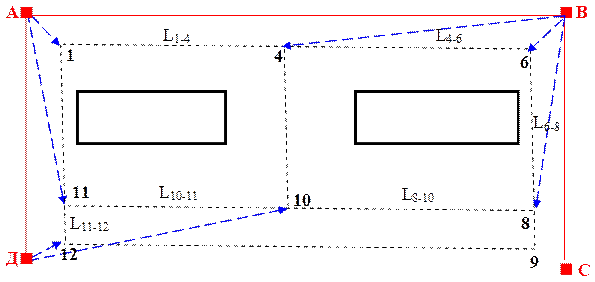 При наличии на земельном участке капитальных зданий и сооружений контроль качества определения координат межевых знаков возможен с использованием метода линейных засечек или при помощи электронного тахеометра. Такой вариант контроля практически полностью соответствует методике, изложенной в разделе 4.4.2.3. и показанной на рис. 4.52. При отсутствии в структурном подразделении электронного тахеометра наиболее простой вариант геодезического обеспечения государственного земельного контроля заключается в измерении длин линий между контролируемыми межевыми знаками и сравнении полученных значений по статистическому критерию