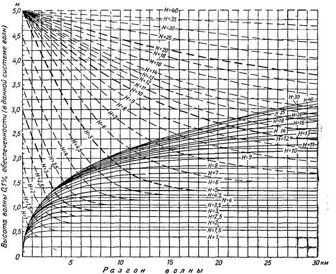 Для узкого водоема при соотношении длины и ширины более 5 из-за рефракции происходит отклонение больших волн к берегу. В этом случае необходимо проверить, не превышает ли высота волны, найденная в каждом промежуточном пункте 2Нm. Где Н глубина воды, m – преобладающая крутизна волны, определяемая по номограмме (рис. 6). При превышении найденную высоту волны уменьшают до высоты 2Нm. При наличии участков с глубиной менее 1, 3 глубины волны волна разбивается. В этом случае расчетную высоту волны уменьшают до 0, 77 Н.