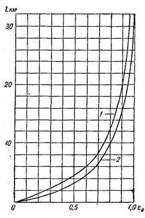 Рис. График коэффициента для определения поправки на наклон дна. 1 – глубина увеличивается, 2 – глубина уменьшается