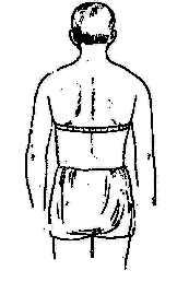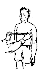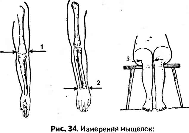 3. — окружность талии — измеряется строго горизонтально на середине расстояния между 10-м ребром и гребнем тазовой кости, т. е. в наиболее узком месте туловища; 4. — окружность (обхват) ягодиц — измеряется горизонтально без нажима. Сзади лента накладывается на наиболее выступающие назад точки ягодичной области, сбоку и впереди идет строго горизонтально; 5. — обхват расслабленного плеча — измеряется горизонтально при свободно опущенной руке в месте наибольшего развития мускулатуры; обхват плеча при максимальном сокращении мышц (максимальный) измеряется в том же месте;
