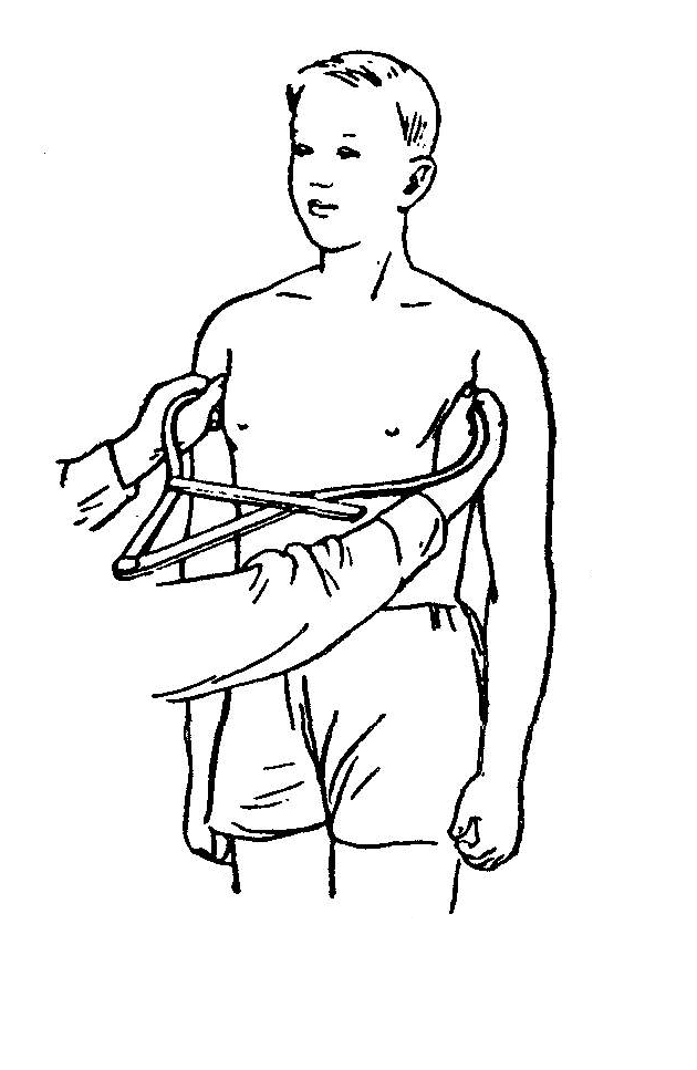 Обхваты (окружности, периметры) на туловище и конечностях измеряются сантиметровой лентой. 1. — окружность шеи — лента накладывается горизонтально, спереди она проходит под щитовидным хрящом, а сзади касается нижним краем верхней части выступа остистого отростка VII шейного позвонка; 2. — обхват груди или окружность грудной клетки — в зависимости от задач исследования — измеряется в трех состояниях: при максимальном вдохе, во время паузы и при максимальном выдохе. Разница между вдохом и выдохом называется экскурсией грудной клетки. Средняя величина экскурсии составляет 5-7 см (у спортсменов — 10—12 см и более). При измерении обхвата груди в спокойном состоянии лента лежит в несколько косом сечении туловища, сзади проходит под нижними углами лопаток, не захватывая их; по боковой стенке грудной клетки лента идет несколько вверх, спереди закрывает нижние сегменты околососковых кружков (у мужчин), у женщин — по верхнему краю молочных желез;