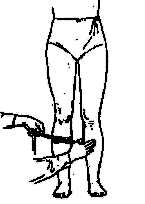 Рис. 12. Определение верхней окружности голени 6. — окружность предплечья — измеряется в верхней его трети при опущенной руке в месте наибольшего развития мышц; 7. — окружность запястья — измеряется в самом узком месте предплечья в нижней его трети; 8. — окружность бедра — лента накладывается горизонтально под ягодичной складкой; 9. — окружность голени (проксимальная) — измеряется в горизонтальной плоскости в месте наибольшего развития икроножной мышцы; 10. — обхват над лодыжками (окружность голени проксимальная) — измеряется в горизонтальной плоскости в наиболее узком месте голени.