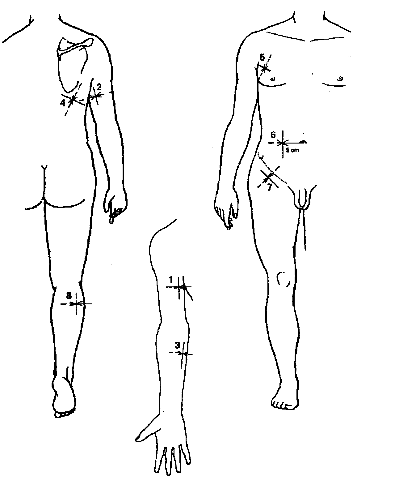 Рис. 13. Измерение кожно-жировых складок: 1 – на плече спереди, 2 – на плече сзади, 3 – на предплечье, 4 –на спине, 5 – на груди, 6 – на животе, 7 – на бедре, 8 - на голени Понятие об осанке. Под осанкой понимают привычную позу непринужденно стоящего человека, держащего корпус и голову прямо, без активного напряжения соответствующих групп мышц. Она зависит от взаимоотношения отдельных частей тела человека, положения центра его массы, особенностей строения скелета (изгибов позвоночного столба), состояния мышечной системы и суставно-связочного аппарата, наклона таза и осей нижних конечностей, формы грудной клетки. Позвоночный столб имеет 4 изгиба. Два из них обращены выпуклостью вперед (шейный и поясничный лордозы), два — выпуклостью назад (грудной и крестцовый кифозы). Все эти физиологические изгибы формируются полностью к возрасту 6—7 лет и закрепляются к 18-20 годам. Нарушения осанки выявляют по изменению изгибов позвоночного столба (измерением кривизны) и визуально (описательная методика).
