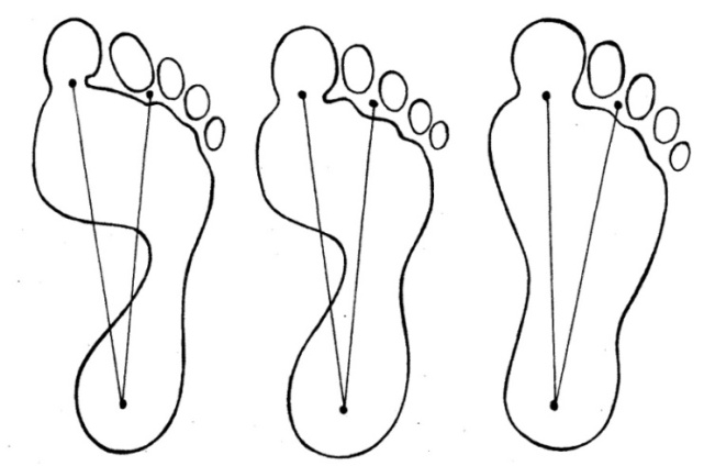 Рис. 15. Оценка плантограмм по методу В. А. Яралова-Яраленда при конструировании обуви. Для снятия отпечатков стопы подошву смазывают слоем типографской или другой краски. Оценку плантограмм проводят по методу В. А. Яралова-Яраленда (см. рис. 15). Для этого на отпечаток наносят две линии: АВ, соединяющую середину пятки с серединой основания большого пальца, и АС, соединяющую середину пятки со вторым межпальцевым промежутком. Если внутренний изгиб контура отпечатка стопы заходит за линии АС или располагается на ее уровне — стопа нормальная, если он находится между линиями АВ и АС — стопа уплощена (плоскостопие 1-ой степени), а если доходит до линии АВ — плоскостопие 2-ой и 3-ей степени (см. рис. 15).