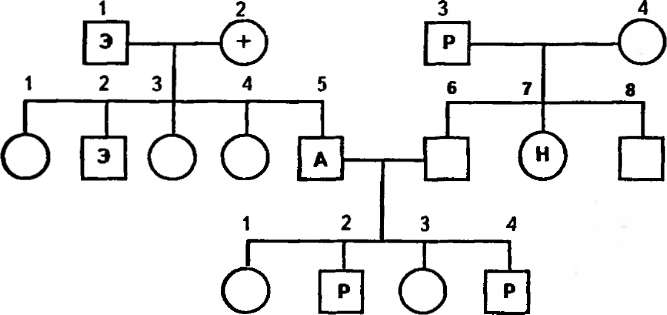 Во время опроса удается собрать достоверные сведения о заболеваниях в трех поколениях семьи: поколении больного, его братьев и сестер (сибсов), двоюродных братьев и сестер; поколении родителей — матери, отца, дядей и тетей; поколении бабушек и дедушек по отцовской и материнской линиям. Опрашиваемый, от которого начинается исследование, именуется пробандом и обозначается под соответствующим символом на родословной буквой П. Родословная изображается графически (см. рис. 20). Каждый индивидуум в родословной имеет свой цифровой шифр. Поколения обозначают римскими цифрами сверху вниз, от более старшего к младшим. В пределах поколения слева направо арабскими цифрами обозначают символы всех индивидуумов. Ниже или на отдельном листе пишут легенду к родословной, в которой соответственно шифру дается краткая характеристика состояния здоровья каждого индивидуума и указывается его возраст. Например, II — 3 — Мария К., тетя пробанда, 20 лет, здорова; I — 2 — бабушка пробанда по линии отца, 60 лет, страдает ревматизмом и т. д. Для быстрого выяснения распространенности заболеваний в родословной, что особенно ценно при изучении мультифакторных заболеваний, внутри символов родословной рекомендуется ставить условные буквенные обозначения болезни, чаше первыми буквами названий. Например, ГН — гломерулонефрит, БА — бронхиальная астма, Р — ревматизм, Э — эпилепсия и т. д. (см. рис. 21). Использование буквенных изображений при мультифакторных заболеваниях))