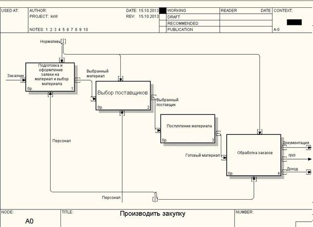 Практическая часть. Создание функциональных информационных моделей предметной области. Предметная область - Бизнес-процесс закупки. Подготовка и оформление заявки на материал · Согласование заявки на материал. Выбор поставщиков · Подготовка списка возможных поставщиков. Выбор поставщиков состоит из следующих этапов: · Получение предложений от возможных поставщиков; · Согласование полученных предложений; · Регистрация получения коммерческих предложений от возможных поставщиков; · Выбор наиболее подходящих поставщиков. Обработка заказов На данной стадии выполняются следующие этапы: