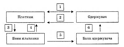 Рис. 4.2. Документообіг при розрахунках платіжними дорученнями (якщо клієнти обслуговуються в різних банках): 1 – укладення угоди-контракту; 2 – відвантаження продукції, товарів, здавання робіт, послуг; 3 – платіжне доручення на списання суми платежу; 4 – витяг із поточного рахунку про списання коштів; 5 – платіжне доручення про зарахування суми платежу; 6 – витяг із поточного рахунку про зарахування коштів Бухгалтерські проводки 1. Проведення розрахунків платіжними дорученнями, якщо клієнти обслуговуються в одному банку: Д-т 2600 (платника) К-т 2600 (одержувача). 2. Проведення розрахунків платіжними дорученнями, якщо клієнти обслуговуються в різних банках: • у банку платника: Д-т 2600 (платника) К-т 1200 • в банку одержувача: Д-т 1200 К-т 2600 (одержувача)