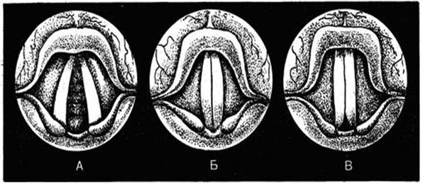 Уклад голосовых складок: А – при дыхании; Б – при фонации; В – при шепоте.