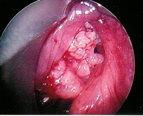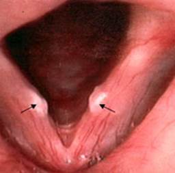 Узелки голосовых связок (на рисунке справа они указаны стрелками)