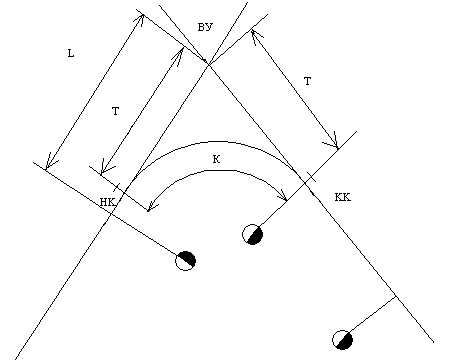 Расчетная схема круговых кривых. ВУ – пикетажное значение вершины угла. НК - пикетажное значение начала круговой кривой. КК – пикетажное значение конца круговой кривой. L – расстояние в пикетах от точки привязки до вершины угла. Тангенс Т, м, и длина проектируемой кривой К, м, определяется по формулам