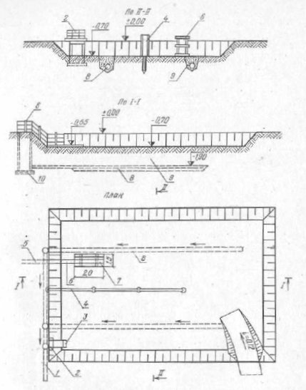 Рис. 3. Схема песковой площадки. 1 – сборная дренажная линия; 2 – мостик; 3 – шахтный водосброс; 4 – перегородка из досок; 5 – пескопровод; 6 – сливной лоток; 7 – деревянный щит; 8 – дренажная труба (d = 75 мм); 9 – дренажная канава; 10 – дренажный колодец.
