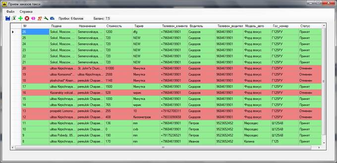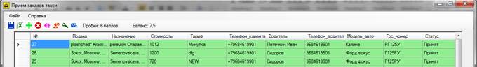 Рис. 2. Меню и панель инструментов Для добавления заказа необходимо нажать на иконку, изображенного в виде зеленого плюса. После нажатия откроется следующее окно, где необходимо выбрать тариф, водителя, ввести адреса, телефон клиента.