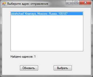 Рис. 4 и 5. Проверка адресов После открытия окна необходимо кликнуть по верному адресу и нажать на копку “Выбрать”. После этого необходимо подсчить стоимость заказа, для этого требуется нажать на кнопку “подсчитать”. После этого, в левое части окна появяться данные о стоимости, времени и расстоянии между пунктами, а также станет активна кнопка “Добавить”.