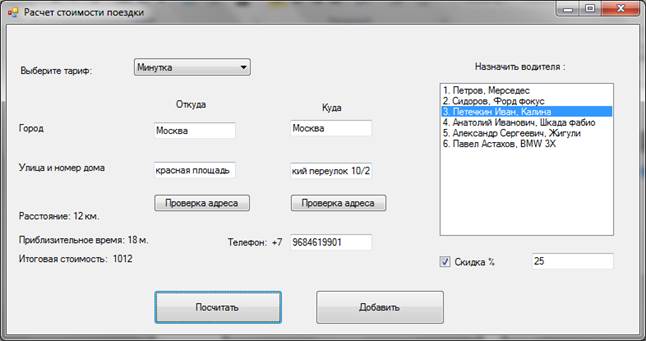Рис. 3. Добавление заказа Прежде чем подсчитать стоимость заказа необходимо проверить адреса нажав на кнопки “проверка адреса”. После нажатия откроется следующее окно.