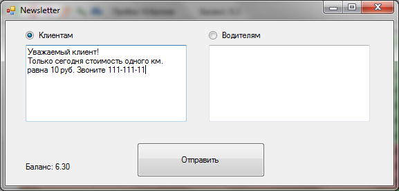 Рис.12. Добавление водителя Также у диспетчера есть возможно делать смс рассылки по спискам водителей или клиентов. Для этого необходимо нажать на иконку с изображением письма на панеле инструментов, ввести текст сообщения и выбрать кому отправить водителям или клиентам.