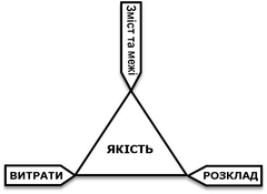 Трикутник управління проектом. Як будь-яке починання, проект виконується та завершується відповідно до певних обмежень. Традиційно такими обмеженнями вважаються «зміст та межі» (англ. Scope), «час» (англ. Time) та «вартість» (англ. Cost).[1] Такі обмеження отримали назву «Трикутник управління проектами», де кожна сторона є певним обмеженням. Одна сторона трикутника не може бути змінена, щоб не вплинути на інші сторони. Подальше уточнення обмежень відділяє «якість» (англ. Quality) чи «продуктивність» впровадження проекту від «змісту та меж» і перетворює якість в четверте обмеження. Обмеження за часом — це час, за який необхідно завершити проект. Вартість — це розмір бюджету, який виділений на реалізацію проекту. Обмеження за змістом та межами — це завдання, які мають бути завершені для досягнення кінцевого результату проекту. Зазначені три обмеження досить часто взаємопов'язані: збільшення меж та обсягів завдань, зазвичай призводить до збільшення часу та вартості, обмежений час може означати збільшення вартості чи зменшення змісту та меж проекту. Наука про управління проектами забезпечує інструменти та методи, що надають змогу команді проекту (не лише менеджеру проекту) організувати свою роботу таким чином, щоб виконати вимоги щодо обмежень.