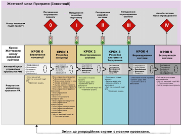 Приклад структури управління IT проектами. Життєвий цикл Програми (Інвестиції) включає управління проектом та життєві цикли впровадження системи разом з активностями, пов'язаними з розгортанням системи та експлуатацією. Відповідно до концепції, управління експлуатацією системи та пов'язані активності, що виникають після завершення проекту, не визначені в цьому посібнику. Наприклад, див. діаграму, у Департаменті управління справами ветеранів Сполучених Штатів (англ. US United States Department of Veterans Affairs - VA) життєвий цикл управління програмою визначений та описаний в Структурі управління IT проектами VA, щоб інтегрувати проектні (інвестиційні) активності та проект в цілому в процес бюджетування. Діаграма «Структура управління проектами» ілюструє Етап 4, який виникає після розгортання системи та закриття проекту. Активності етапу закриття проекту в VA продовжуються протягом розгортання системи та переходять в етап експлуатації системи з метою відображення активностей, які вважаються частиною проекту. Діаграма показує дії та пов'язані артефакти процесу Управління IT проектами та програмами в VA.