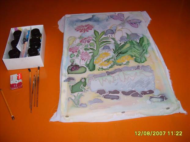 Балашов 2011 Введение Техника безопасности в процессе работы над росписью тканей Во время выполнения работ, связанных с подготовкой материала к росписи и крашению, необходимо соблюдать правила техники безопасности: 1. Быть крайне осторожными и аккуратными с воспламеняющимися, ядовитыми и сильнодействующими веществами и помнить, что все химические вещества и красители ядовиты. 2. На рабочем месте должны находится только нужные для работы красители и химические препараты. Посуда с химическими веществами и красителями должна быть плотно закрыта. На ней должны быть этикетки с разборчивым их названием. Не рекомендуется брать препараты руками, пробовать их на вкус. 3. Изготовление красильных, химических растворов необходимо делать при открытых окнах или в помещениях с вытяжным шкафом. 4. Некоторые вещества при смешивании вступают между собой в реакцию, выделяя большое количество теплоты, вследствие чего возможен пожар. 5. Необходимо очень осторожно обращаться с кислотами и особенно с их концентрированными растворами, так как они раздражают слизистые оболочки, могут привести к сильным ожогам кожи. Хранить их надо в плотно закрытой стеклянной посуде, в случае попадания кислоты на кожу необходимо сразу же промыть ее сначала водой, а потом слабым раствором соды. Во время приготовления кислотных растворов нужно помнить, что кислоту нужно вливать в воду, а не наоборот. 6. Необходимо быть очень осторожным во время изготовления резервных растворов для холодного и горячего батика. Компоненты этих смесей (резиновый клей, парафин, не говоря уже о бензине) являются сильно воспламеняющимися и взрывчатыми веществами, а пары парафина очень вредны. Резервные смеси необходимо варить на закрытом огне в хорошо проветриваемом помещении, при этом нельзя нагибаться над посудой, вдыхать выделяемые пары. Стоимость материалов.