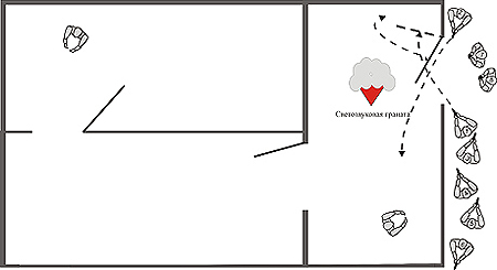 По решению руководителя операции группа захвата может покинуть данное помещение. ВАРИАНТ: “ДИНАМИЧНЫЙ ШТУРМ” Данный вариант применяется, как правило, когда существует вероятность встретить активное вооруженное сопротивление со стороны находящегося в помещении противника, в комнате могут находиться женщины, больные. Подразделение обучено, имеет опыт боевых действий, морально-психологическая подготовка на высоком уровне. С началом операции целесообразно использовать специальные средства, оказывающие шоковое воздействие на противника. Схема действий внутри комнат: Начало штурма (выбивание двери, забрасывание светозвуковых гранат).