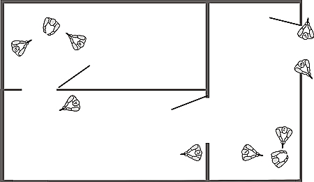 После получения сигнала «Чисто, чисто, вперёд!», 2-ая (сотрудник №3, №4) и 3-я (сотрудник №5, №6) пара выдвигается к входу в следующую комнату.
