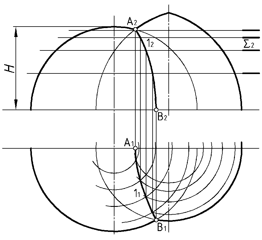 Пример 4 (Рис.48). Построить линию пересечения закрытого тора и полусферы.