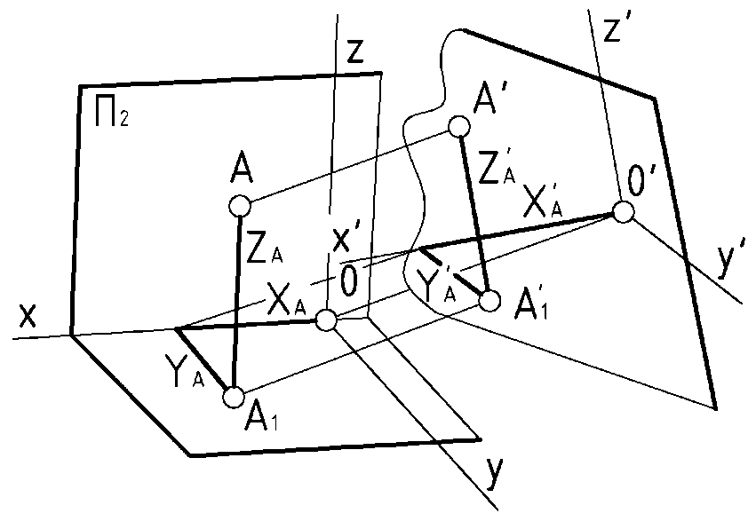 Горизонтальные проецирующие секущие плоскости пересекают заданные поверхности по вспомогательным окружностям с простыми проекциями. Пересекаясь попарно окружности определяют точки, принадлежащие линии пересечения заданных поверхностей. Обычный алгоритм решения. Напомним только и дополним последовательность решения задач на пересечение поверхностей применительно к способу проецирующих секущих плоскостей: 1) Выбрать способ решения задачи. 2) Построить опорные точки линии пересечения любым способом и обозначить их буквами. (В данном случае – это самая высокая точка 3) Ограничить опорными точками область применения посредников (размер 4) Построить необходимое число промежуточных точек линии пересечения выбранным методом и при необходимости обозначить их цифрами. 5) Построить линию пересечения. 6) Обвести чертеж в целом с учетом видимости. Аксонометрия – это изображение предмета на плоскости общего положения П’ в системе аксонометрических осей проекций В общем случае аксонометрия включает в себя (рис.72): – Картину осей с коэффициентами искажения по осям. – Аксонометрическое изображение. – Вторичную проекцию (при необходимости использовать значения координат).
