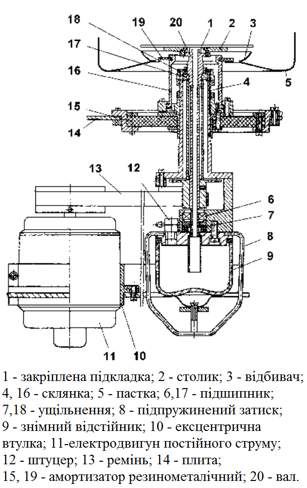 Базова центрифуга зображена на рисунку 1. Закріплення підкладки 1 на столику 2 проводиться вакуумом, що подається через осьовий отвір вала 20, відстійник 9 і штуцер 12. Електродвигун постійного струму 11 і ремінь 13 забезпечують обертання столика з регульованою частотою в діапазоні 300... 10000 об.-1. Час розгону до максимального числа оборотів становить 0, 5 ± 0, 1 с. Вал 20 обертається в підшипниках 6 і 17. Стакан 4, в якому закріплено верхній підшипник, пов'язаний з плитою 14 через ряд перехідних втулок і резинометалічний амортизатор 15. У верхній частині стакана 16 закріплений другий амортизатор 19, до якого під час технологічної операції притискається відбивач 3 пастки 5 для збору продуктів обробки. Підшипниковий вузол центрифуги охороняється від впливу рідких реактивів ущільненнями 7 і 18. З’ємний відстійник 9, який закріплюється в нижній частині центрифуги підпружиненним затискачом 8, запобігає потраплянню продуктів обробки у вакуумну систему. Натяг ременя 13 регулюється за допомогою повороту ексцентричної втулки 10 з електродвигуном 11. У автоматі гідромеханічної відмивання використовується миючий пристрій, показане на рисунку 2.