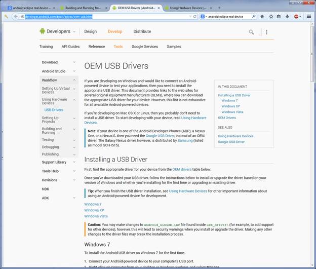 Для тестирования разработанных мобильных приложений можно использовать не только эмулятор мобильного устройства, но и реальное мобильное устройство. Прежде всего, на мобильном устройстве, необходимо в «Настройках» выбрать пункт «Для разработчиков» и активировать режим «Отладка по USB» (Settings > Developer options > USB debugging). Следуя инструкциям официального сайта, https://developer.android.com/tools/extras/oem-usb.html (рис. 1), установить драйвера для вашего мобильного устройства.