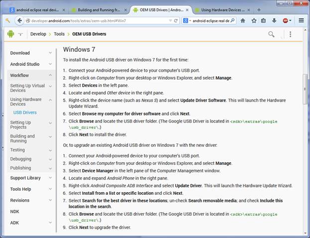 Рис. 1. Страница официального сайта разработки android-приложений На рис. 2 приведена последовательность действий по установке для ОС Windows 7.