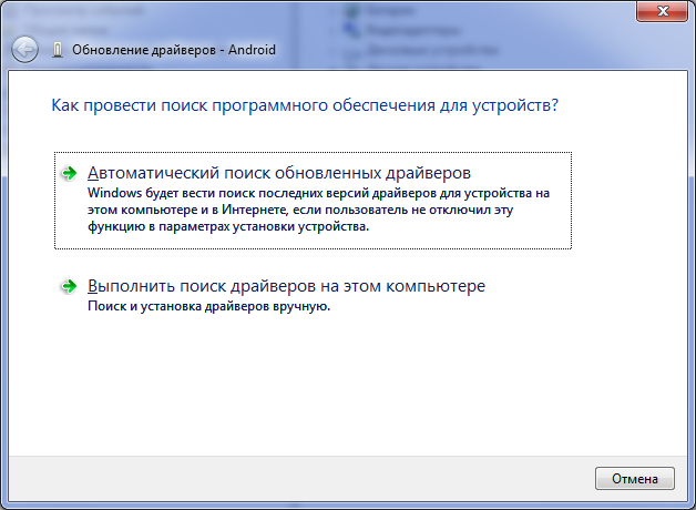 Рис. 4. Запуск мастера обновления драйверов Выбрать пункт «Поиск драйверов на этом компьютере», и в открывшемся диалоге указать путь к драйверам: < sdk> \extras\google\usb_driver\. Здесь < SDK> - путь к установленной SDK Android (рис. 5). Если ваше устройство не опознано, то необходимо найти драйвера в Интернете.