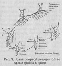 (рис. 9). Она позволяет пловцу опереться о воду и оттолкнуться от нее (согласно третьему закону Ньютона). Дополнительные движущие силы. При движении взаимосвязанных звеньев тела пловца с ускорением относительно друг друга возникают внутренние инерционные силы. Они направлены в сторону, противоположную ускорению. Инерционные силы мешают продвижению пловца,