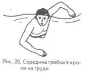 Фаза «захвата». Кисть ребром ладони движется вперед-вниз и немного кнаружи. Пловец, испытывая на ладони давление встречного потока воды, начинает сгибать кисть, выполняя захват. Плечевой пояс поворачивается вслед за рукой, это способствует более эффективному захвату. Для успешного выполнения захвата пловец должен обладать хорошей подвижностью в плечевых суставах. К концу фазы захвата кисть оказывается ниже горизонтальной плоскости спины. Продолжительность фазы составляет 0, 15—0, 18 с (примерно 15 % от времени полного цикла движений). Фаза «подтягивания». В этой фазе происходит изменение направления движения кисти, связанного со сгибанием и вращением предплечья в локтевом суставе. Кисть движется назад и вверх. Рабочие плоскости кисти и предплечья занимают фронтальное положение, удобное и наиболее эффективное для опоры. За счет мощного приведения плеча пловец подтягивается. В первой половине гребка движение ладонью — ведущее по отношению к локтю. Как и в кроле на груди, локоть удерживается и остается развернутым вниз и в сторону, но не назад; в противном случае теряется всякий смысл движения в этой фазе. Рука энергично сгибается в локтевом суставе, благодаря чему выполняется быстрое скользящее движение кистью, основным движителем, что и обеспечивает эффективность создания опоры. Угол сгибания руки в локтевом суставе достигает своей максимальной величины — 75—110°. Продолжительность фазы — 0, 18—0, 24 с (15—17 % от времени всего цикла). Фаза «отталкивания». Отталкивание начинается в момент прохождения кистью руки линии плеч. В этой фазе происходит разгибание руки в локтевом суставе за счет мощного сокраще- ния мышц туловища, плечевого пояса. Кисть скользит по криволинейной траектории до полного выпрямления руки в локтевом суставе. Фаза завершается захлестывающим движением кисти назад-вниз. В конце гребка она оказывается ниже бедра, примерно на той же глубине, что и в фазе захвата. Продолжительность фазы отталкивания—0, 22—0, 29 с (20—25 % от времени полного цикла движений). Фаза «выходруки из воды». Движение руки в этой фазе — быстрое и сколь- зящее. Рука выпрямлена, повернута ладонью к бедру. Расслабленная кисть выходит из воды большим пальцем или тыльной стороной, при этом уменьшаются сопротивление воды и соответственно действие топящих сил. Выходу руки из воды способствуют крен тела в противоположную сторону (другая рука находится на входе в воду) и приподнимание над поверхностью воды плеча руки, завершившей гребок. Продолжительность фазы — 0, 10—0, 12 с (6—10 % от времени полного цикла движений руки). Подготовительное движение рукой («пронос») выполняется строго в вертикальной плоскости над телом, в едином ритме движений другой рукой. При движении над водой рука прямая и расслабленная. К моменту начала следующего цикла ее движение несколько ускоряется, однако рука «не шлепается» в воду, а входит мягко. Продолжительность фазы (периода) — 0, 40—0, 50 с (30—35% от всего времени движения руки). Руки движутся «в противофазе»: когда одна рука заканчивает гребок и выходит из воды, другая входит в воду и начинает захват. Вместе с тем рука, проходя по воздуху, на какое-то мгновение оказывается в воде раньше, чем кисть, завершающая рабочее движение, и в момент захвата движение как бы передается с одной руки на другую. Дыхание. Дыхание чаще всего соглас