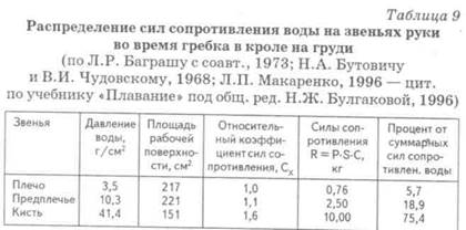 и многими другими причинами. На коротких дистанциях, как правило, используются шести-, восьмиударные координации; на стайерских дистанциях — двухударная координация. Движения руками. Движения руками попеременные. Это обеспечивает экономичность техники и ее эффективность, так как попеременная работа позволяет большее время без перерыва создавать тяговые усилия внутри цикла, «мягче» передавать движение с одного работающего звена на другое. Руки — основной движитель в кроле. Распределение сил сопротивления воды на звеньях руки во время гребка показано в табл. 9.