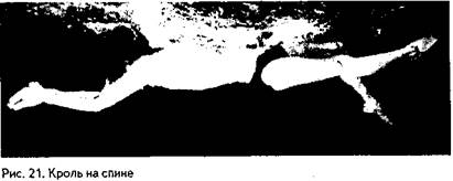 Представляется, что с точки зрения координации кроль на спине — самый сложный спортивный способ плавания. Положение тела. При плавании на спине плечи находятся несколько выше таза. Уровень воды проходит у линии ушей, под подбородком, и касается верхней части груди. Угол атаки колеблется в более широких пределах, чем в кроле на груди. В целом положение пловца на воде относительно горизонтальное, угол атаки составляет в среднем 8—10°. Спортс-мены-спинисты, как правило, высокие, легкие, сухие, обладают хорошей плавучестью. Как и в кроле на груди, при плавании на спине наблюдаются значительные колебания тела относительно продольной оси: они достигают 30—35°. Такое отклонение бывает в середине гребка одной рукой и во время движения другой рукой над поверхностью воды в подготовительном движении. Наиболее плоское положение наблюдается тогда, когда одна рука закончила гребок и вытянута у бедра, а другая после движения над водой коснулась поверхности воды (на входе). Положение головы во время плавания на спине остается относительно стабильным. Шея прямая. Ее мышцы расслаблены. Пловец смотрит вверх и немного назад. Ось головы является продолжением оси туловища. Движения ногами. Движения ногами попеременные, в направлениях сверху вниз и снизу вверх. Сверху вниз — подготовительное, снизу вверх — рабочее движения. Исходное положение. Нога, закончив рабочее движение, полностью выпрямлена, стопа находится у поверхности, носок оттянут. Таз лежит несколько ниже поверхности: между линией ноги и горизонтальной линией — острый угол. Подготовительное движение. Первую половину подготовительного движения вниз нога движется практически прямой. В результате этого таз и бедра (и в целом положение тела) становятся выше. В дальнейшем голень и стопа продолжают начатое движение вниз, бедро же несколько отстает, происходит сгибание ноги в коленном суставе. К моменту, когда угол между бедром и горизонталью составит около 8—10°, бедро останавливается и изменяет направление своего движения, стопа же и голень продолжают движение вниз. Подготовительную часть можно считать законченной, когда угол между передней поверхностью голени и стопы и горизонтальной составляющей достигнет примерно 45°.
