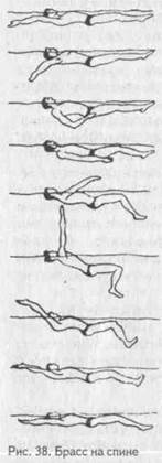 В настоящий момент способ имеет прикладное значение. Лучший результат в плавании брассом на спине на дистанции 100 м и показанный в 1912 г. О. Фаром (Германия) составляет 1.15, 6. Прикладная ценность брасса заключается в том, что пловец находится в очень удобном для дыхания и отдыха положении, гребковые движения ногами позволяют создать большие тяговые усилия, а его неудобство заключается в том, что зрительный анализатор практически оказывается выключенным, в силу этого человек слабо ориентируется в пространстве. Положение тела. Пловец лежит на спине, находясь на поверхности воды (рис. 38); руки выпрямлены и вытянуты вперед, ладони обращены в стороны и расположены напротив одноименных плечевых суставов; ноги выпрямлены, соединены вместе. Руки, ноги, туловище и голова вытянуты вдоль одной линии, угол атаки близок к 0°. Движения ногами начинаются с подготовительного периода: происходит сгибание в коленных суставах, бедра остаются параллельными поверхности, колени при этом практически не «выглядывают» из воды. Таким образом, наибольшее движение наблюдается на уровне голеней и стоп. Заканчивается подготовительное движение, как и в классическом брассе, активным разведением стоп в стороны. Вместе со стопами в стороны частично разворачиваются и голени. В момент окончания подготовительного периода величина угла между бедром и туловищем составляет примерно 150°, а между задней поверхностью бедра и голенью — 90°. Рабочее движение выполняется активным разгибанием ног в коленных суставах с опорой на внутренние поверхности голени и стопы. Направления выполняемого рабочего движения •— назад-в стороны-вверх к поверхности воды. Заканчивается рабочее движение полным выпрямлением ног и их сведением у средней линии тела. Движения руками. Гребок рукой практически такой же, как и в кроле на спине. Главное сходство заключается в том, что он выполняется со сгибанием руки в локтевом суставе. Преимущественное направление гребка — «назад». Заканчивается гребок полностью выпрямленными у бедер руками. Подготовительное движение выполняется проносом прямых рук над поверхностью воды. Общая согласованность движений. Цикл движений состоит из одного симметричного и одновременного движения руками и одного симметричного и одновременного движения ногами, одного вдоха и выдоха. Начинается цикл с движений руками. В момент завершения рабочего движения руками ноги начинают подготовительное движение. Начатое ногами подготовительное движение без паузы, без промедления «подхватывается» рабочим движением, руки в этой части движения проносятся над водой. Вдох выполняется в момент рабочего движения ногами, когда руки проносятся над водой. Техника плавания способом брасс на спине представлена на рис. 38. Техника ныряния Техника ныряния включает способы погружения под воду, способы передвижения под водой, всплывание, а также мероприятия, обеспечивающие ныряние. Разумеется, навыки ныряния формируются в процессе изучения техники спортивных и прикладных способов плавания, стартов и поворотов, однако их изучение требует специальных подходов. Подготовка к нырянию. Нырянию всегда предшествует задержка дыхания, иногда ее длительность существенно лимитирует продолжительность нахождения под водой. Задержка дыхания зависит от осббенностей утилизации организмом 