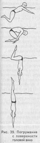 ных движений не увеличивает длительности задержки дыхания, потому нецелесообразно. Кроме того, могут появиться головокружения. Вдохи и выдохи должны быть спокойными. Механизм этого приема очень прост и легкообъясним известной физиологической закономерностью. Дело в том, что углекислота, образовавшаяся в результате утилизации кислорода, является мощным раздражителем дыхательного центра. Гипервентиляция приводит к «вымыванию» углекислоты — ее уменьшению, и субъективно ощущается меньшая потребность вдыхании. Находясь под водой, человек через некоторое время начинает испытывать потребность в дыхании. Чтобы дольше остаться под водой и при этом легче переносить недостаток кислорода, необходимо при закрытой ротовой полости выполнить два-три глотательных движения затем — очень небольшой выдох. Такие действия уменьшают внутрилегочное давление и немного выводят из организма излишки углекислоты. В дальнейшем надо оказаться на поверхности и после выдоха остатков воздуха в воду, сделать глубокий вдох. Для быстрой ликвидации кислородного долга, образовавшегося в результате нахождения под водой, рекомендуется снова проделать гипервентиляцию легких. Это лучше сделать, не выходя из воды. При погружении на глубину — это известно — возрастает гидростатическое давление, что вызывает сжатие эластичных поверхностей легочного аппарата (воздухоносные пути, легкие), а также других полостей. Так, например, при погружении на глубину 20 м объем легких уменьшается в три раза. Большее сжатие может привести к потере сознания и даже к гибели организма. Сопротивление волнообразованию при передвижении под водой отсутствует, потому скорость плавания значительно выше. Целесообразно нырять в длину, находясь на глубине 60^-80 см от поверхности. Ориентировка под водой затруднена, поэтому нырять необходимо только с открытыми глазами, в условиях плохой видимости — с вытянутыми вперед руками. Техника погружения в воду с поверхности Головой вниз. Техника выполнения этого элемента представлена на рис.39. Энергичным надавливанием слегка согнутыми руками вниз пловец приподнимается вверх, над поверхностью воды, выполняет вдох, группируется. В этом положении делает пол-оборота вперед, погружается головой вниз, разгруппировывается, выпрямляется, поднимает ноги над водой. За счет веса ног и энергичной помощи руками быстро погружается под воду. Ногами вниз. При погружении ногами вниз с поверхности пловец выполняет энергичное движение (надавливание) и руками, и ногами вниз; ногами — желательно «брассовое» движение — с разворотом стоп в стороны. За счет таких энергичных движений голова, тело пловца приподнимутся высоко над поверхностью воды. Следует вдох. За счет веса частей тела, оказавшихся над поверхностью воды, идет погружение в воду (рис. 40). Для ускорения погружения можно выполнить помогающие движения руками. Техника передвижения под водой Техника передвижения под водой — производная от техники плавания. Комбинация различных элементов техники, различные варианты координации используются пловцами для передвижения под водой. Наиболее распространены следующие способы: скольжение в вытяну- том положении, различные варианты брасса на груди, плавание на боку, комбинированные варианты. «Скольжение». Обычное скольжение под водой выполняется с иде