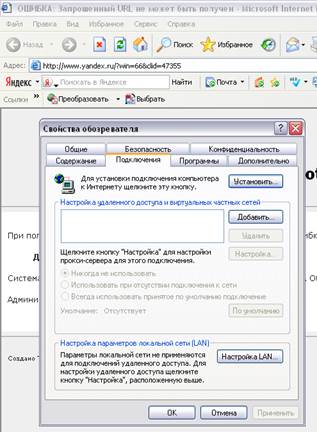 b. Если мы настраиваем Internet Explorer 6.0 В функциональной кнопке «Сервис» находим «Свойства обозревателя», закладку «Подключения».