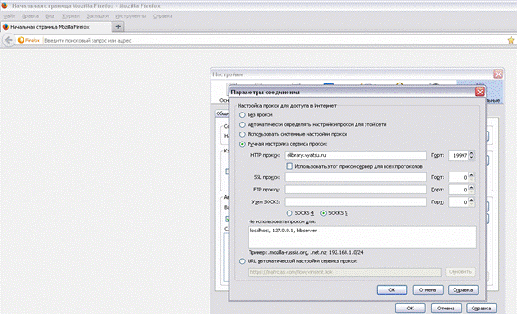 На открывшейся странице нажмем кнопку «Прокси-серверы…». В диалоговом окне ставим галочку напротив HTTP, в поле Адрес пишем elibrary.vyatsu.ru, в поле Порт 19997.