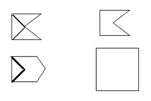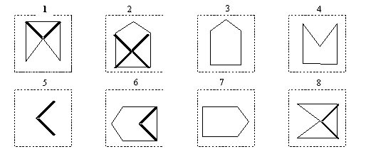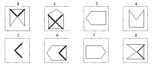 Рис. 2 Психолог просто показывает, как решается задача, т.е. берет нужный квадрат и помещает его на рисунок без устных комментариев. Ребенку дается небольшое время, чтобы он понял принцип решения задачи. После показа решения задания-образца, переходят к основной задаче. Ребенку дается бланк со второй задачей, но ни в коем случае нельзя давать ее решать, т.е. нельзя позволять ребенку манипулировать с квадратиками. Ребенок должен просто видеть задачу и решать ее «в уме». Далее следует первый вопрос: «Ты знаешь, как решается эта задача?» Ребенок должен устно рассказать способ решения. Если ребенок устно не точно рассказывает о решении задачи или вообще затрудняется с рассказом, но заявляет, что знает решение, то следует задать уточняющий вопрос: «Ты знаешь, какой квадратик надо положить, вернуть на место? Если знаешь, покажи его». Ответ ребенка может показать, какие именно условия задачи он выделяет в качестве ключевых для решения задачи. Но дети не всегда могут вербально выразить то, что они сделали «в уме», поэтому и задается уточняющий вопрос. Если ребенок не знает, как решается вторая задача, или не может указать верный квадрат, то ему опять без комментариев показывается решение второй задачи, а затем задается второй вопрос. «Твой(твоя) сверстник(сверстница) тоже решала эту задачу. Сначала она сделала вот так». Далее берется квадрат № 3. В этом варианте правильно указан контур, но нет линий внутри контура. У ребенка спрашивают: «Решил ли твой(твоя) сверстник(сверстница) задачу? Почему?» Все ответы ребенка должны тщательно фиксироваться. Следующим перекладывается квадрат № 5. В этом варианте правильно проведены линии внутри контура, но сам контур отсутствует. У ребенка опять спрашивают, решил ли его сверстник задачу и почему. «Твой сверстник сделал третью попытку решить задачу». После этого берется правильный вариант № 6, но в воздухе квадратик переворачивается на 900 по часовой или против часовой стрелки, так что оказывается, что хотя элемент выбран и правильно, но ориентировка его на схеме не правильна, как показано на рисунках 3 а и 3 б. У ребенка спрашивают: «Решил ли твой(твоя) сверстник(сверстница) задачу? Почему?»
