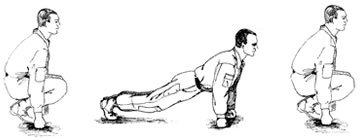 Исходное положение упор присев. Принять положение упор лежа и вернуться в исходное положение, повторить 10-15 раз. Упражнение № 2