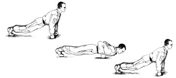 Перевернуться со спины на живот, принять исходное положение упор лежа, согнуть руки в локтях до касания грудью пола (земли), выпрямить руки. Упражнение № 4