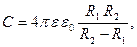 где R 1 и R 2 – радиусы коаксиальных цилиндров, разделенных слоем диэлектрика. Ёмкость сферического конденсатора:
