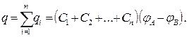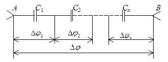 то есть при параллельном соединении конденсаторов она равна сумме ёмкостей отдельных конденсаторов. При последовательном соединении конденсаторов (рис.10.2) заряды всех обкладок равны по модулю, а разность потенциалов на зажимах батареи равна: