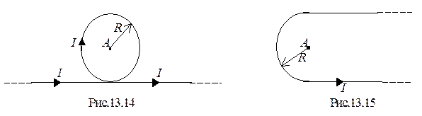 Задача 1. По бесконечному прямому проводнику идёт ток 20 А. Проводник образует петлю, радиус которой R = 2 см. Определить индукцию магнитного поля в центре петли по величине и направлению (рис. 13.14).