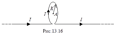 Задача 3. Прямой бесконечно длинный провод с током I = 10 А образует в середине кольцевой виток радиусом R = 3 см, плоскость которого перпендикулярна проводу. Определить индукцию магнитного поля по величине и направлению в точке, лежащей в центре витка (рис. 13.16).