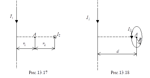 Задача 5. По прямому бесконечно длинному проводу течёт ток I 1 = = 3, 14 А. Круговой виток с током I 2 = 3 А радиусом R = 30 см расположен так, что плоскость его параллельна прямому проводнику, а перпендикуляр, опущенный из центра витка на провод, является нормалью к плоскости витка. Расстояние от центра витка до провода равна d = 20 см. Найти индукцию магнитного поля в центре витка (рис. 13.18). Ответ: B = 7× 10-6 Тл.