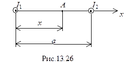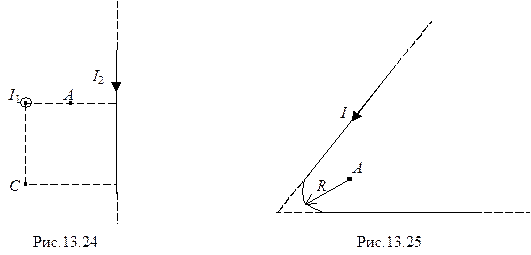 Задача 30. Два бесконечных прямых проводника находятся в одной плоскости под углом 900 друг к другу. Определить индукцию магнитного поля в точках А1 и А2 (рис. 13.27), если