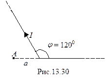 Задача 35*. Определить магнитную индукцию В, созданную прямым бесконечным током I = 20 А, согнутым под углом 1200 в точке А, лежащей на продолжении горизонтальной части провода (рис. 13.30) на расстоянии а = 10 см от вершины угла. Ответ: ВА = 3, 5× 10-5 Тл.