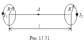Задача 36*. Два круговых контура с токами I 1 = 10 А и I 2 = 20 А лежат в параллельных плоскостях. Расстояние между центрами контуров l = = 20 см, радиусы контуров R 1 = R 2 = 10 см. Определить индукцию магнитного поля, созданного контурами в точке, лежащей посередине расстояния между ними, если: а) токи идут в одном направлении; б) токи идут в противоположных направлениях (рис. 13.31). Ответ: а) ВА = 0, 66 10-4 Тл.; б) ВА=0, 22 10-4 Тл