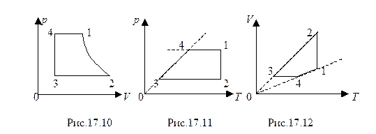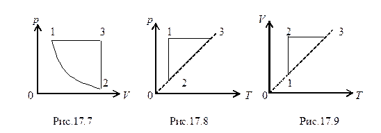 2. На участке 2-3 газ изохорически нагревается, его давление увеличивается. В координатах р, Т изохора представляет собой прямую, проходящую через 0 и точку 2. 3. Участок 3-1 – изобара, причем температура на этой прямой изменяется от Т 3 до первоначальной Т 1, следовательно, изобара должна проходить через первую точку параллельно оси температур. Так можно найти точку 3 в координатах р, Т (рис. 17.8). Координаты V, T (рис. 17.9). 1. Участок 1-2 – изотерма, причем объем возрастает, значит точка 1 ниже точки 2 (см. рис.17.9). 2. Участок 2-3 – изохорное нагревание – прямая параллельная оси температур. 3. Участок 3-1 – изобарное охлаждение, причем система возвращается к первому состоянию. Точку 3 находим как точку пересечения изохоры и изобары.